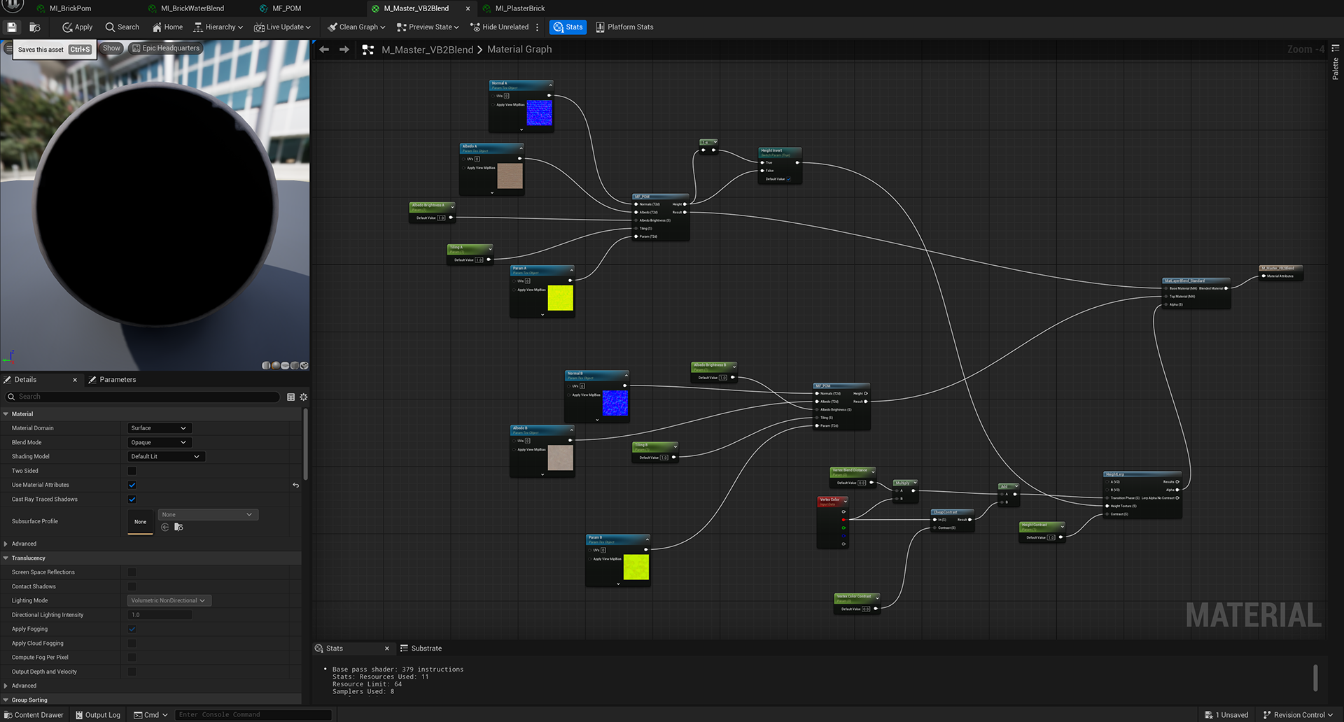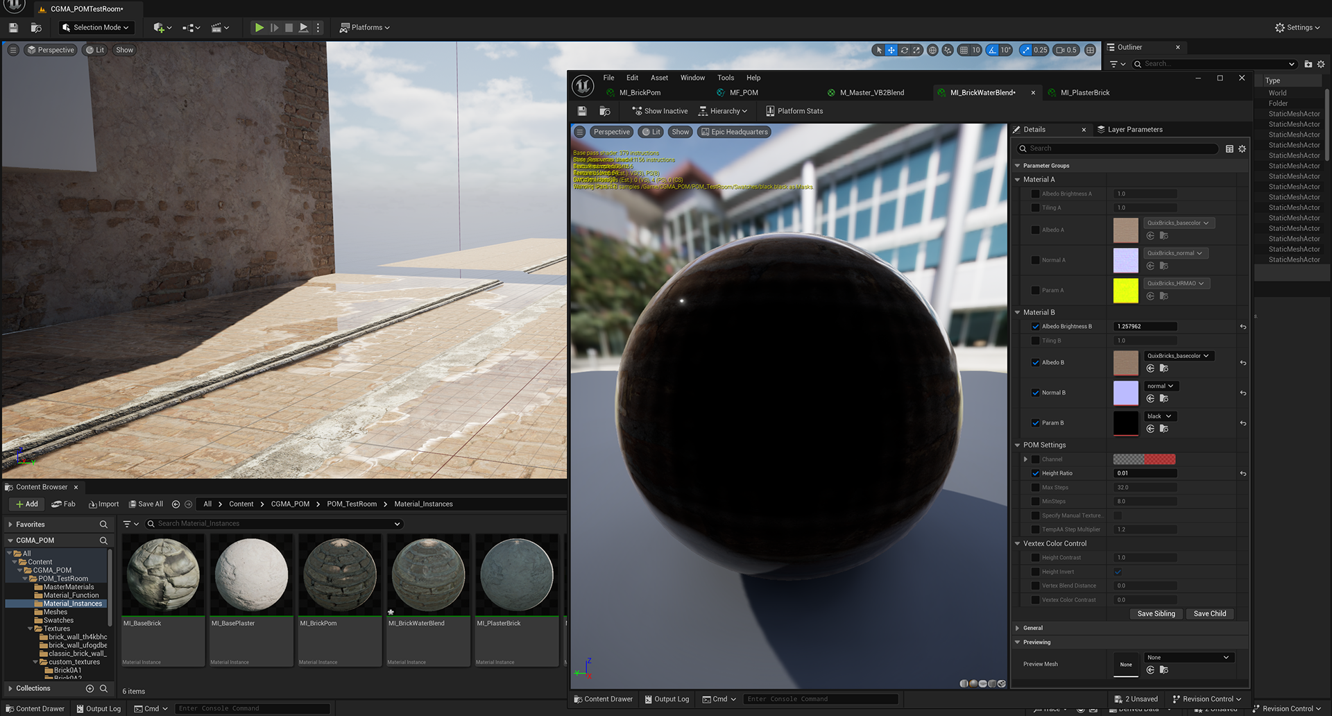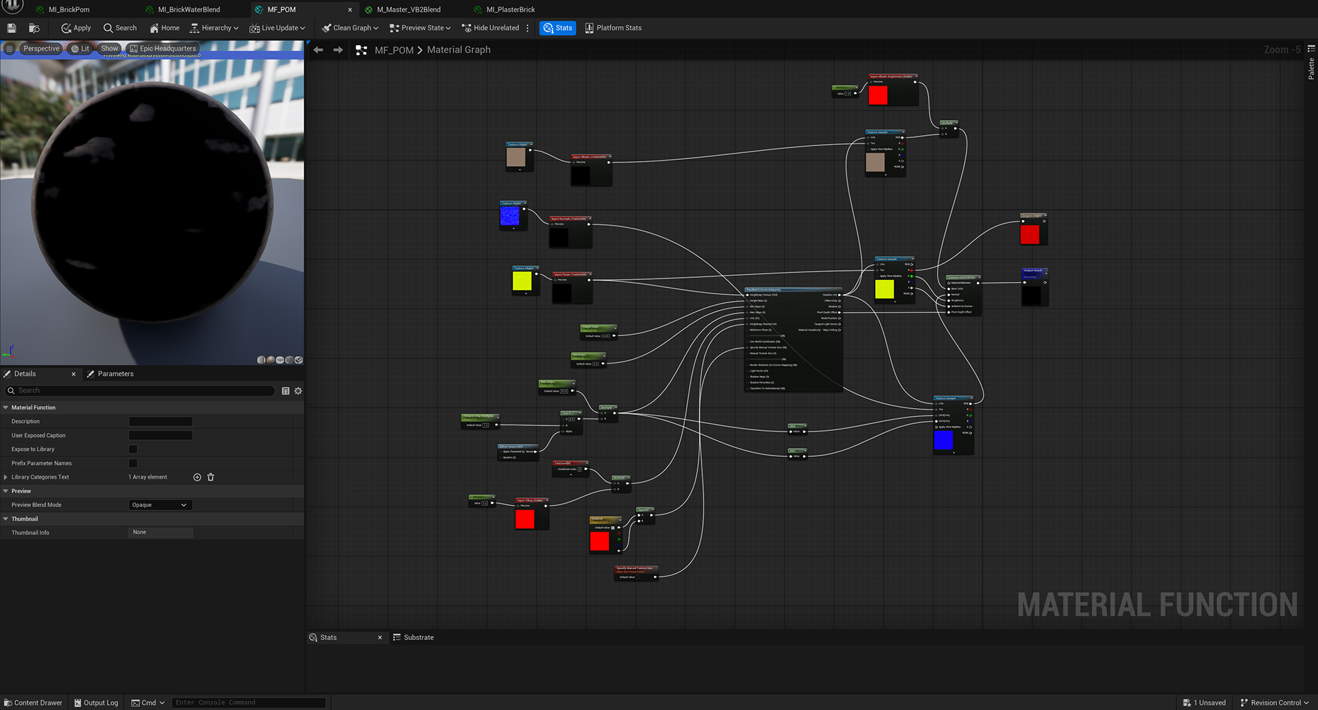 Week 2: Unreal Engine shader/ material translation. This week involved bringing the generated materials into Unreal Engine 5 and setting up blend shaders for environment implementation. Experimentation and development here revolved around building the shader graphs and tuning the height levels for the various generated materials.
