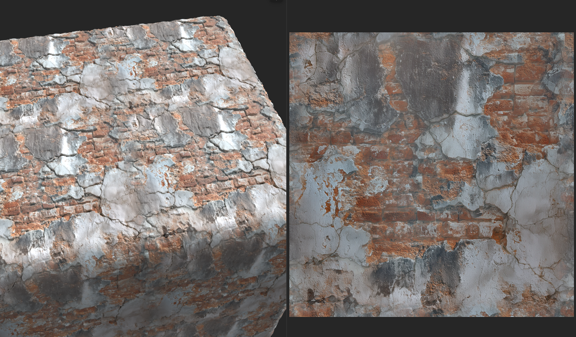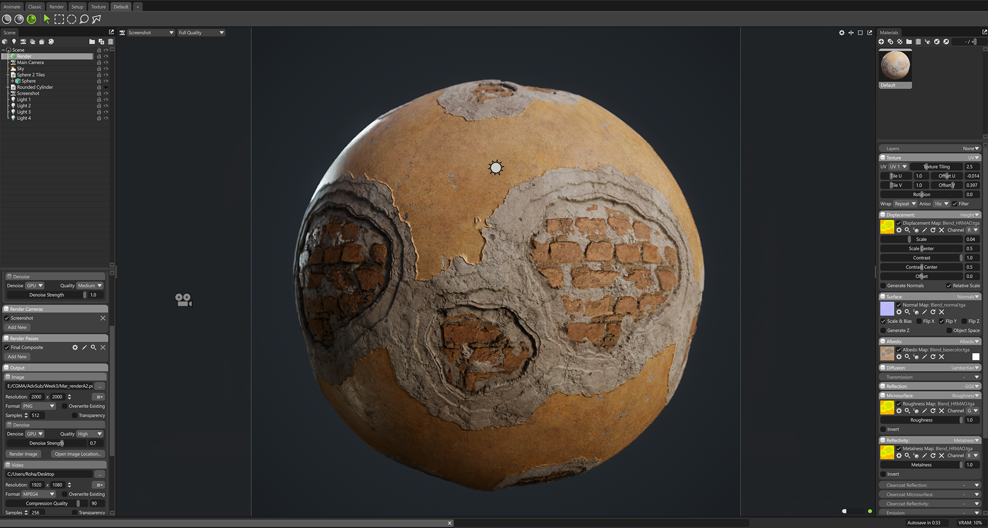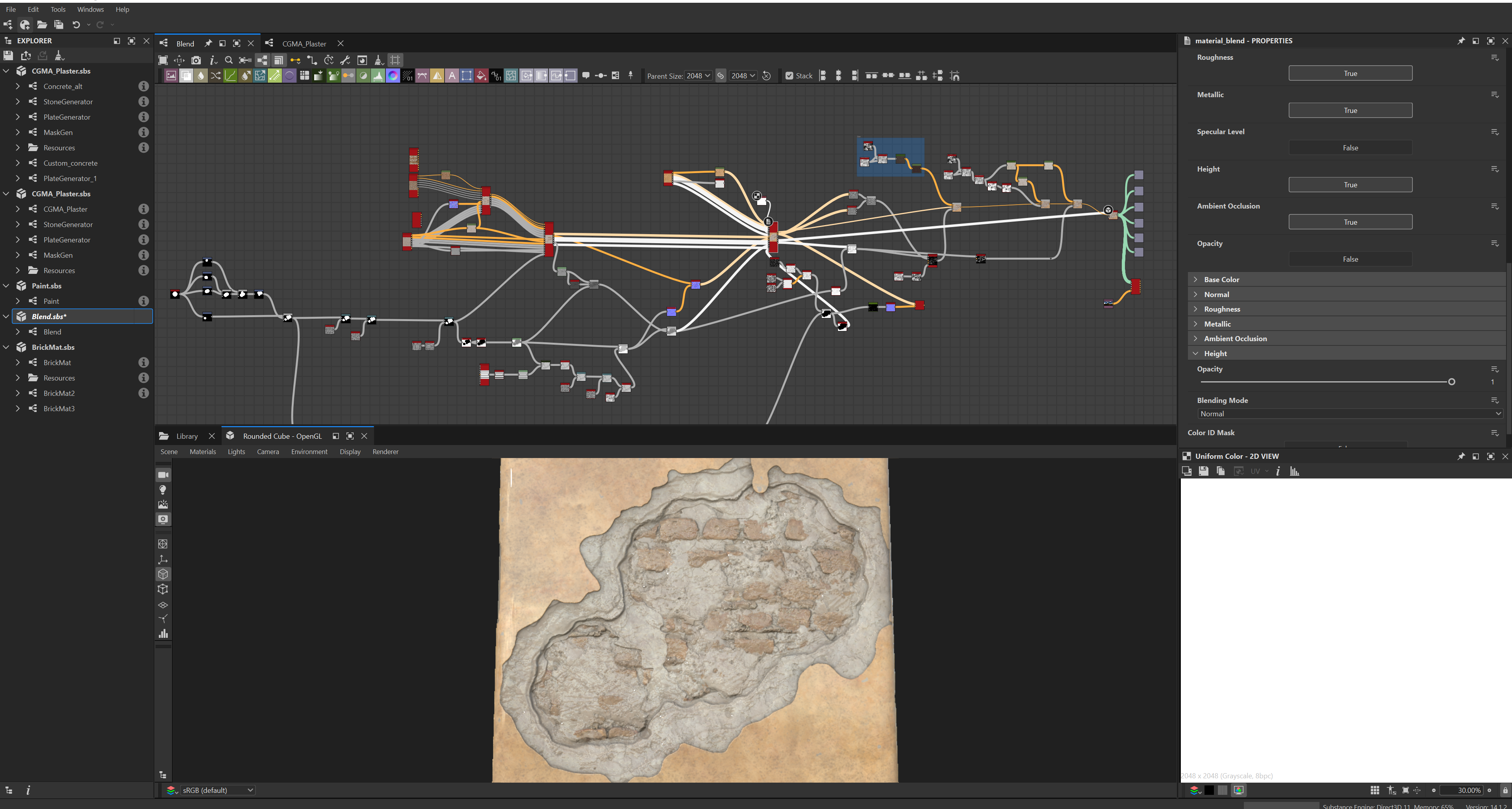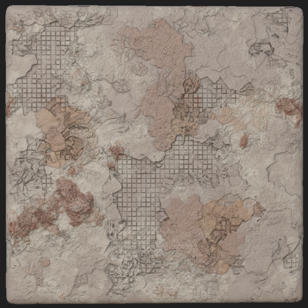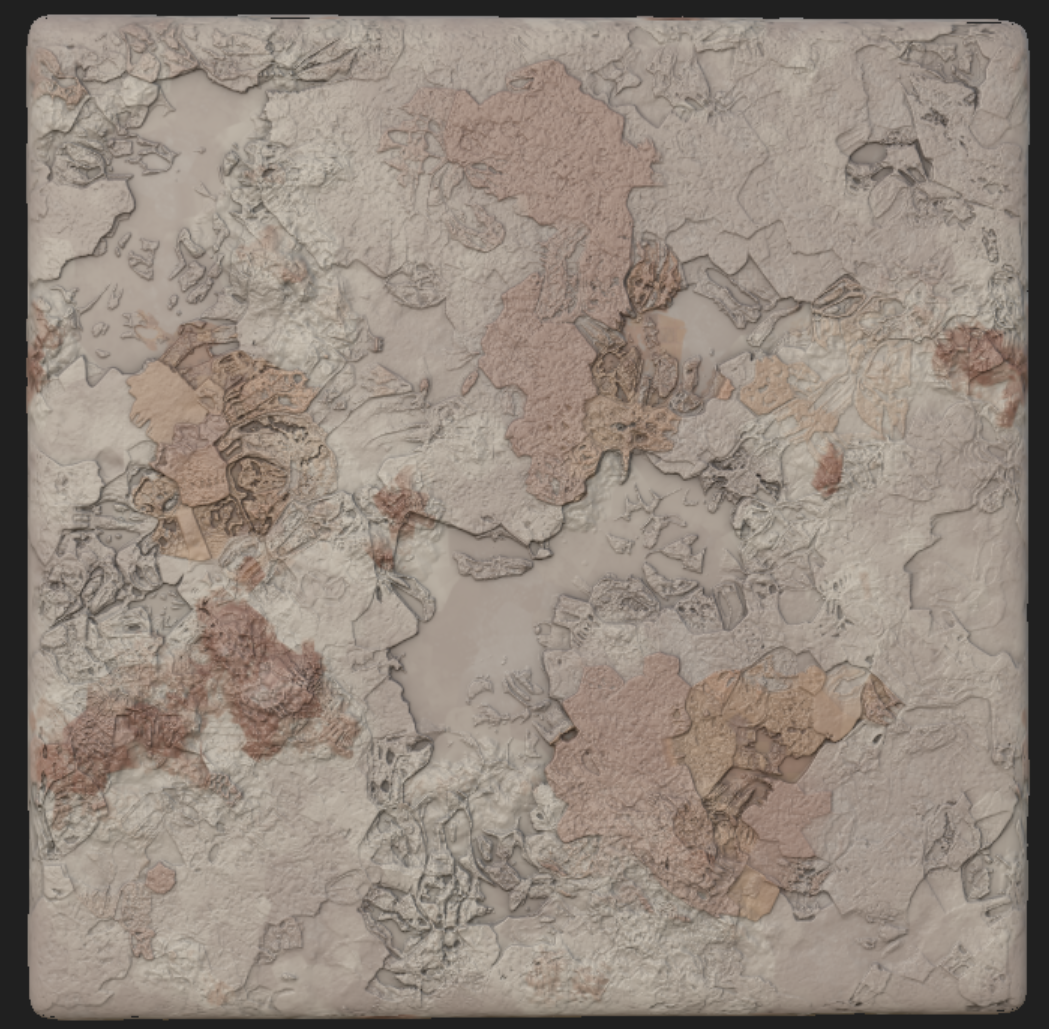 Week 1: Initial layers developed and captured via Substance Designer. The target for this initial set was inspired by Thai temple ruins, which are characterized by flaking/ layered concrete, brick, and plaster. Experimentation surrounded creating these targets and testing the limits of the tools.