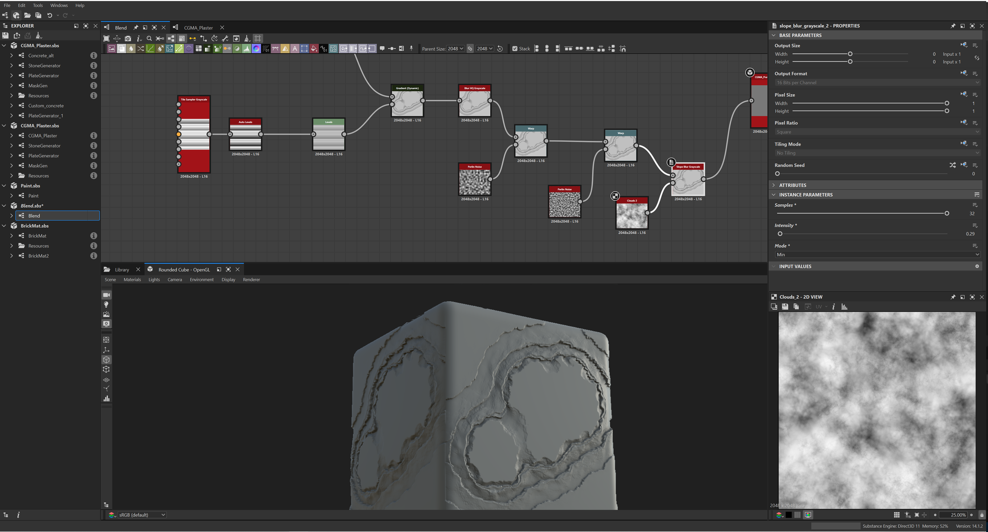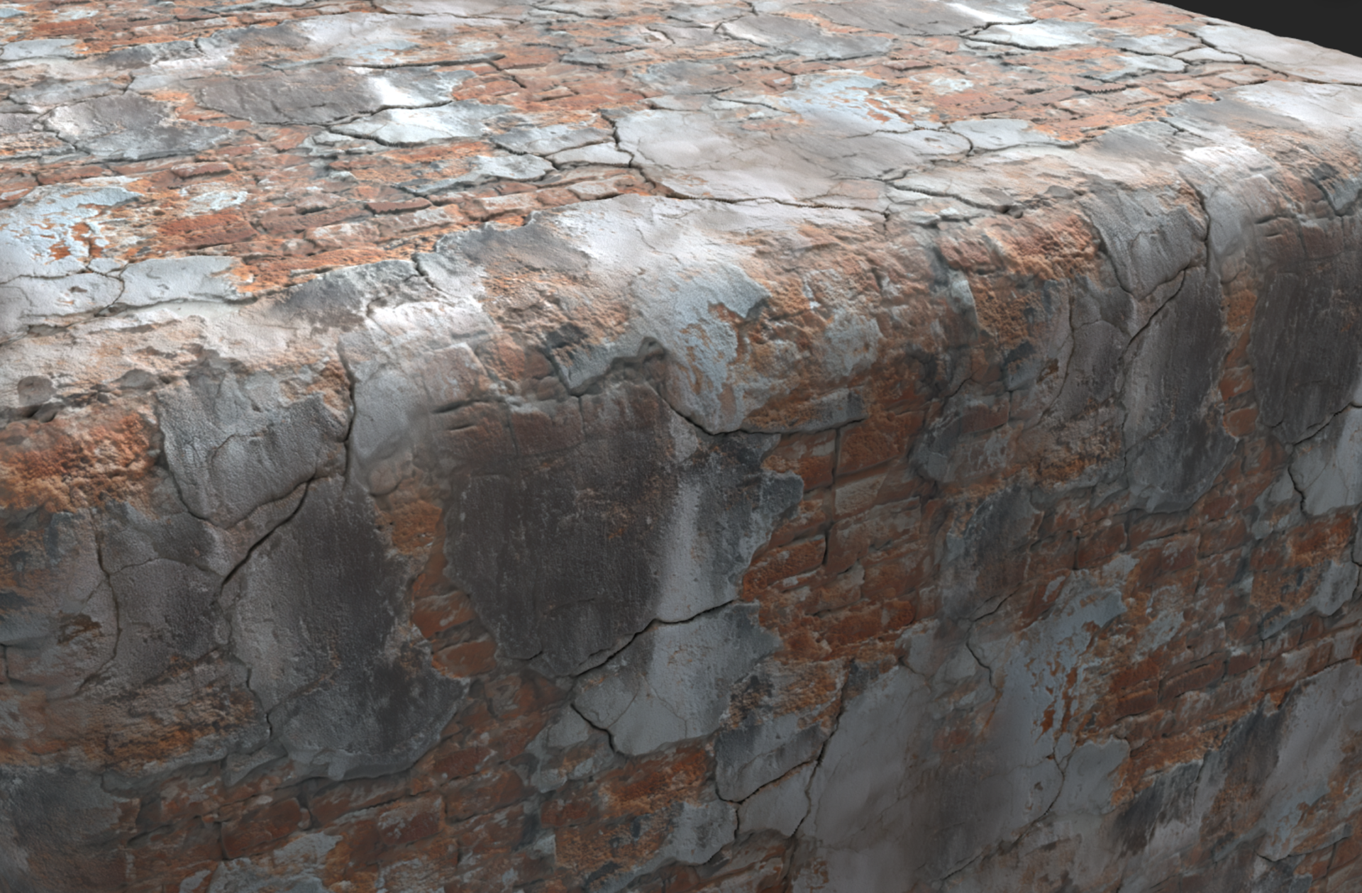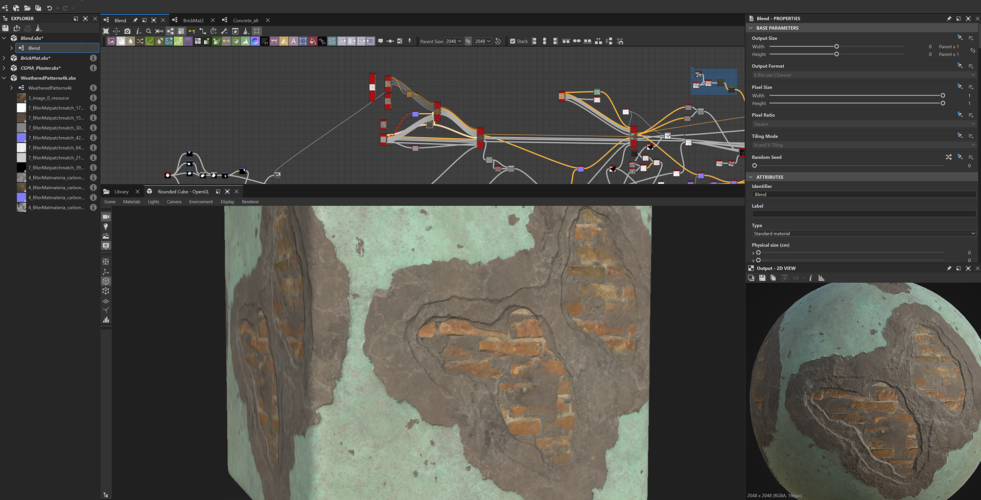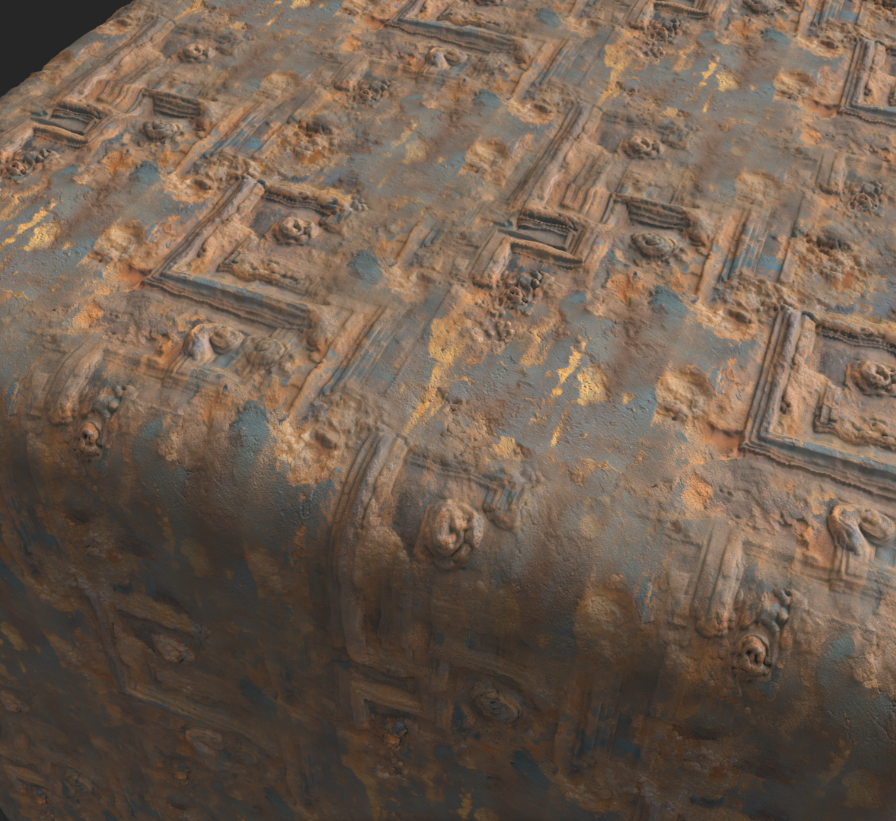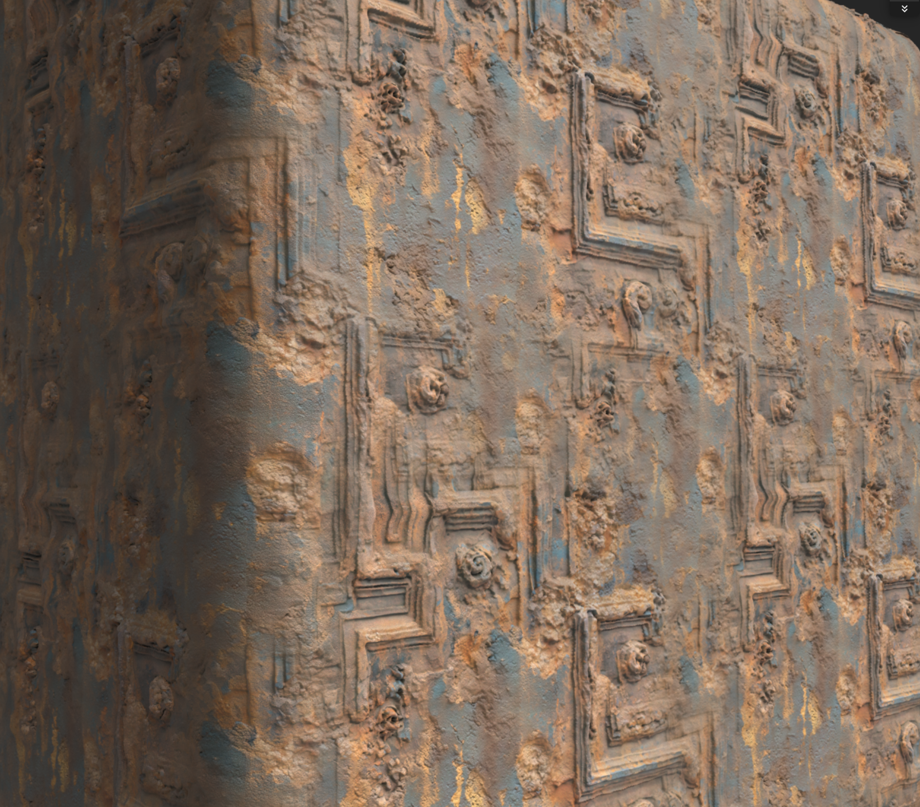 Week 1: Initial layers developed and captured via Substance Designer. The target for this initial set was inspired by Thai temple ruins, which are characterized by flaking/ layered concrete, brick, and plaster. Experimentation surrounded creating these targets and testing the limits of the tools.