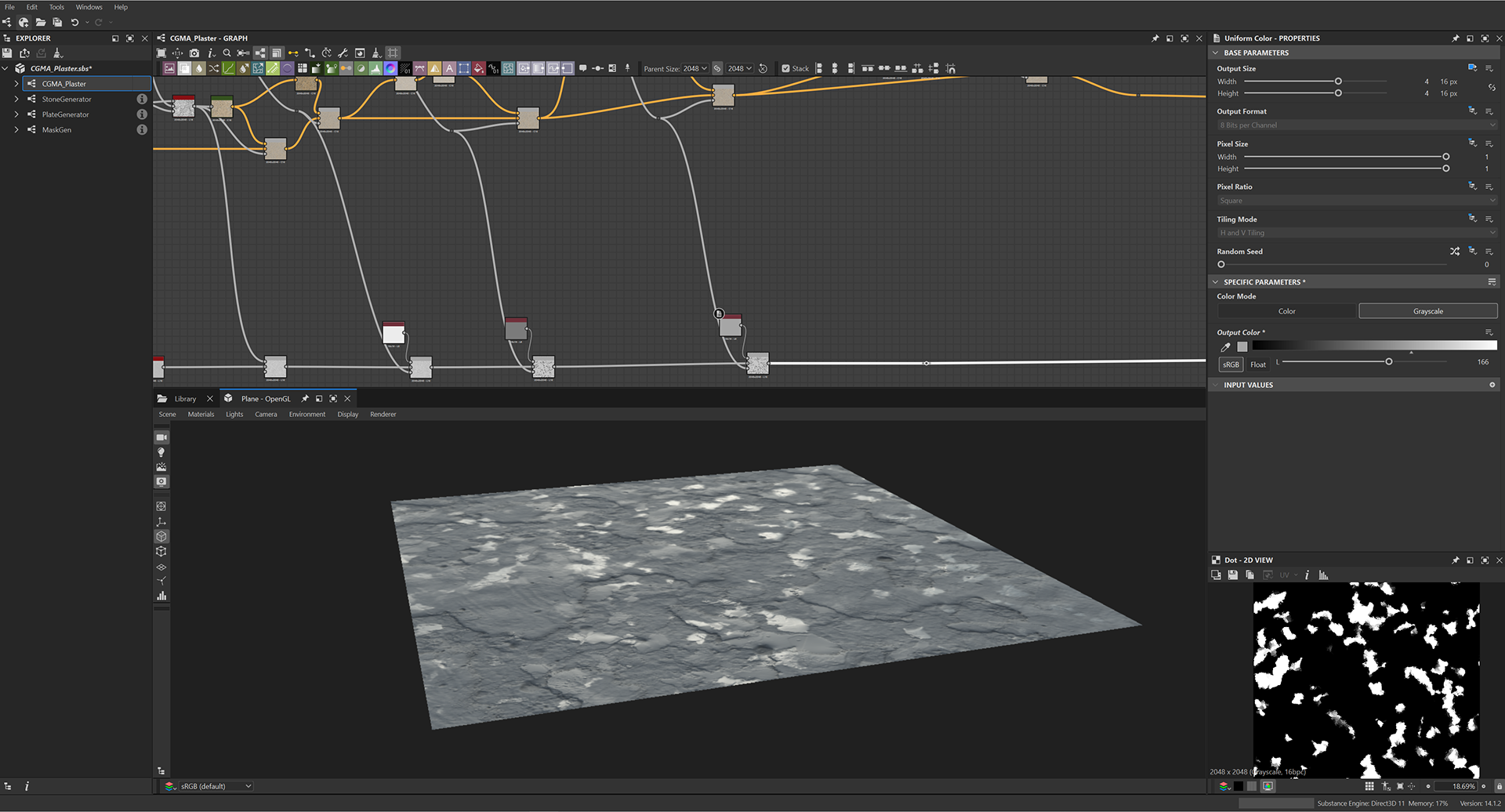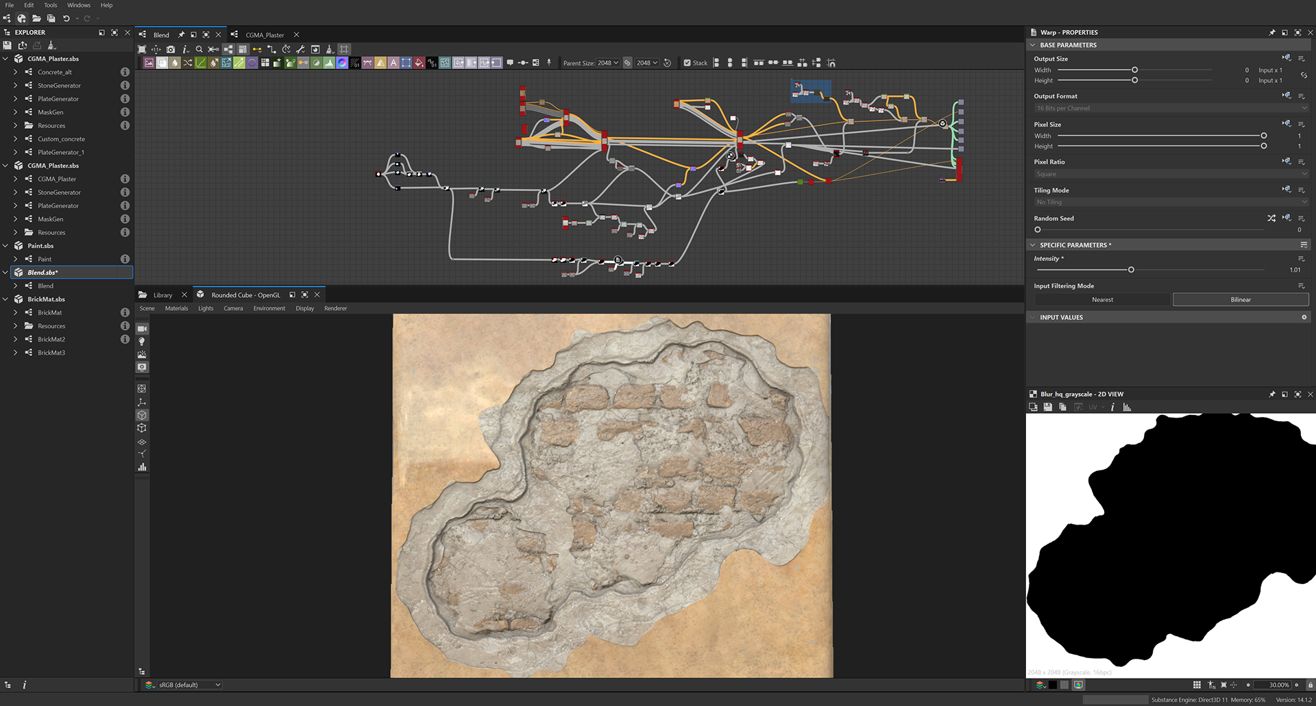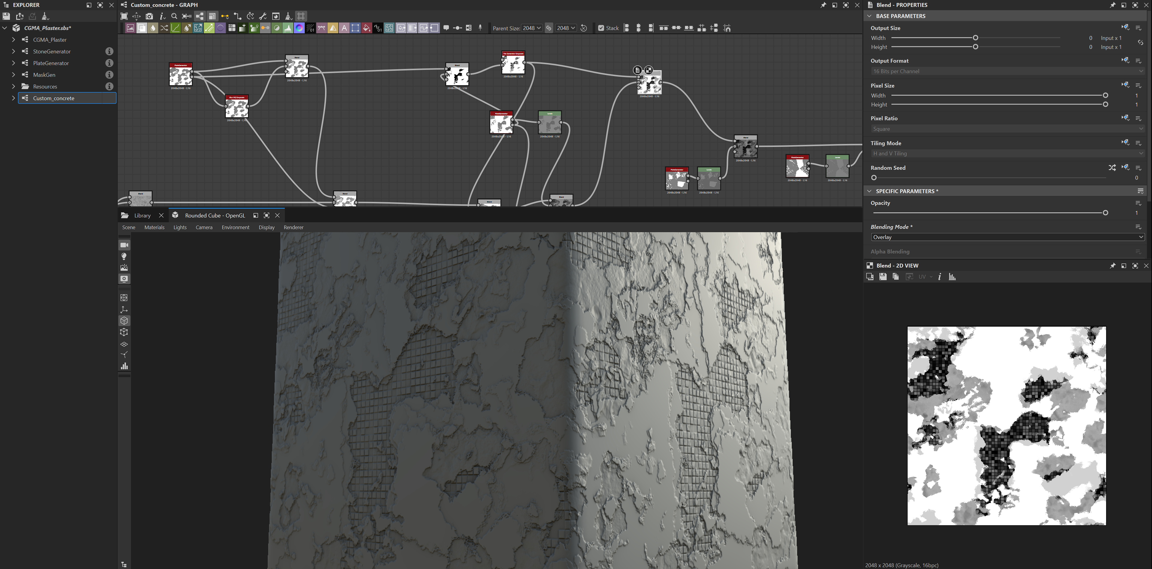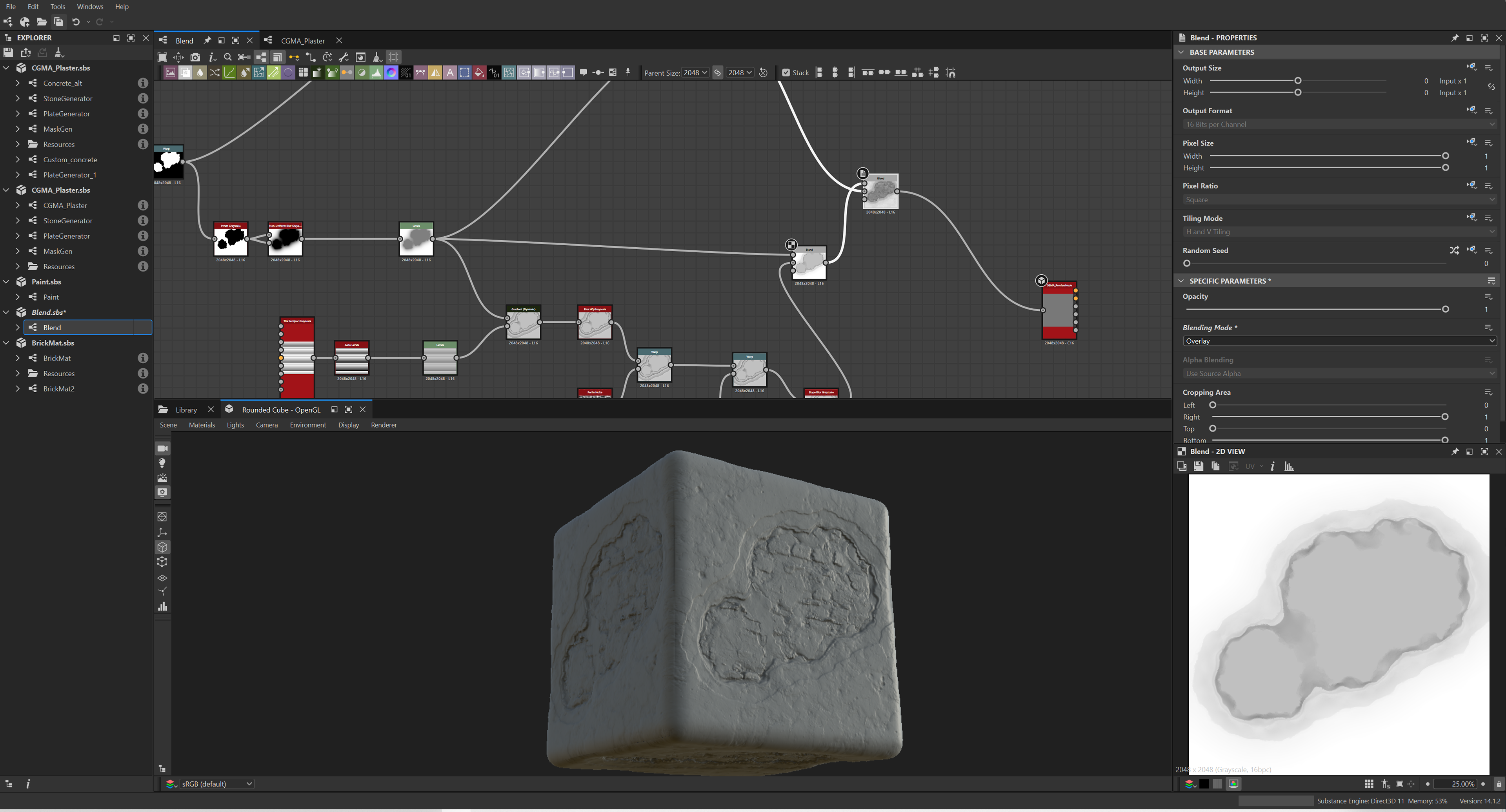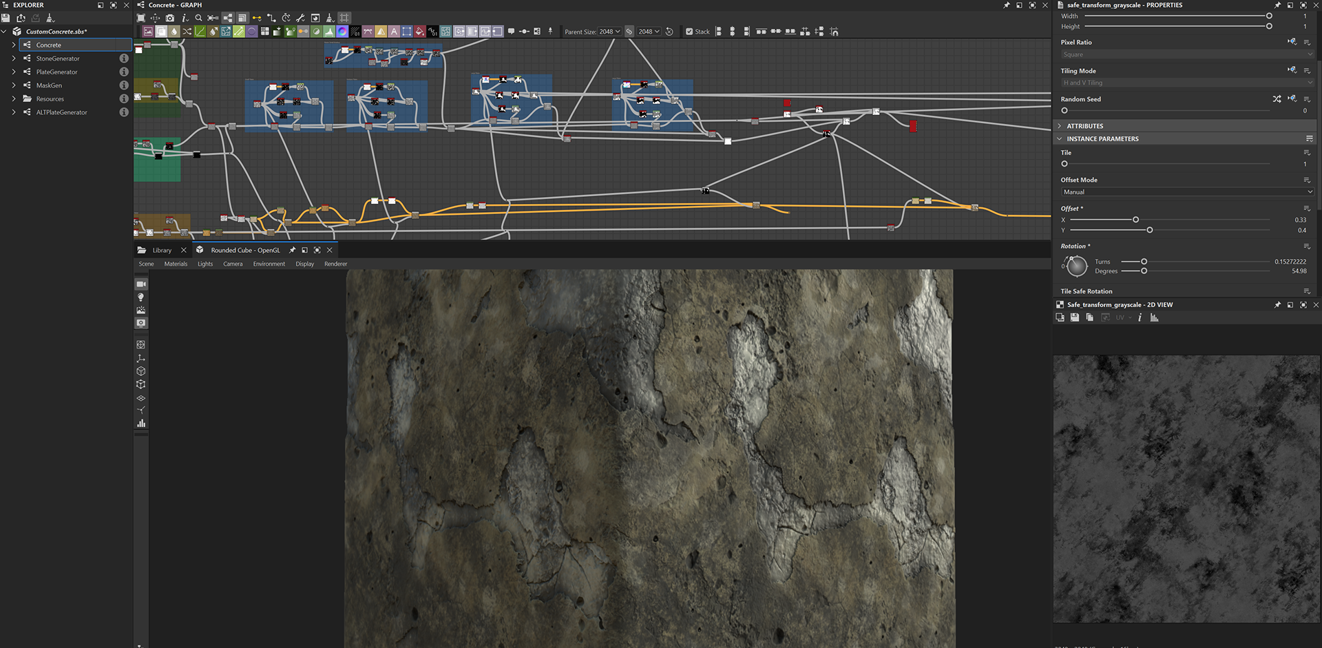Week 1: Initial layers developed and captured via Substance Designer. The target for this initial set was inspired by Thai temple ruins, which are characterized by flaking/ layered concrete, brick, and plaster. Experimentation surrounded creating these targets and testing the limits of the tools.