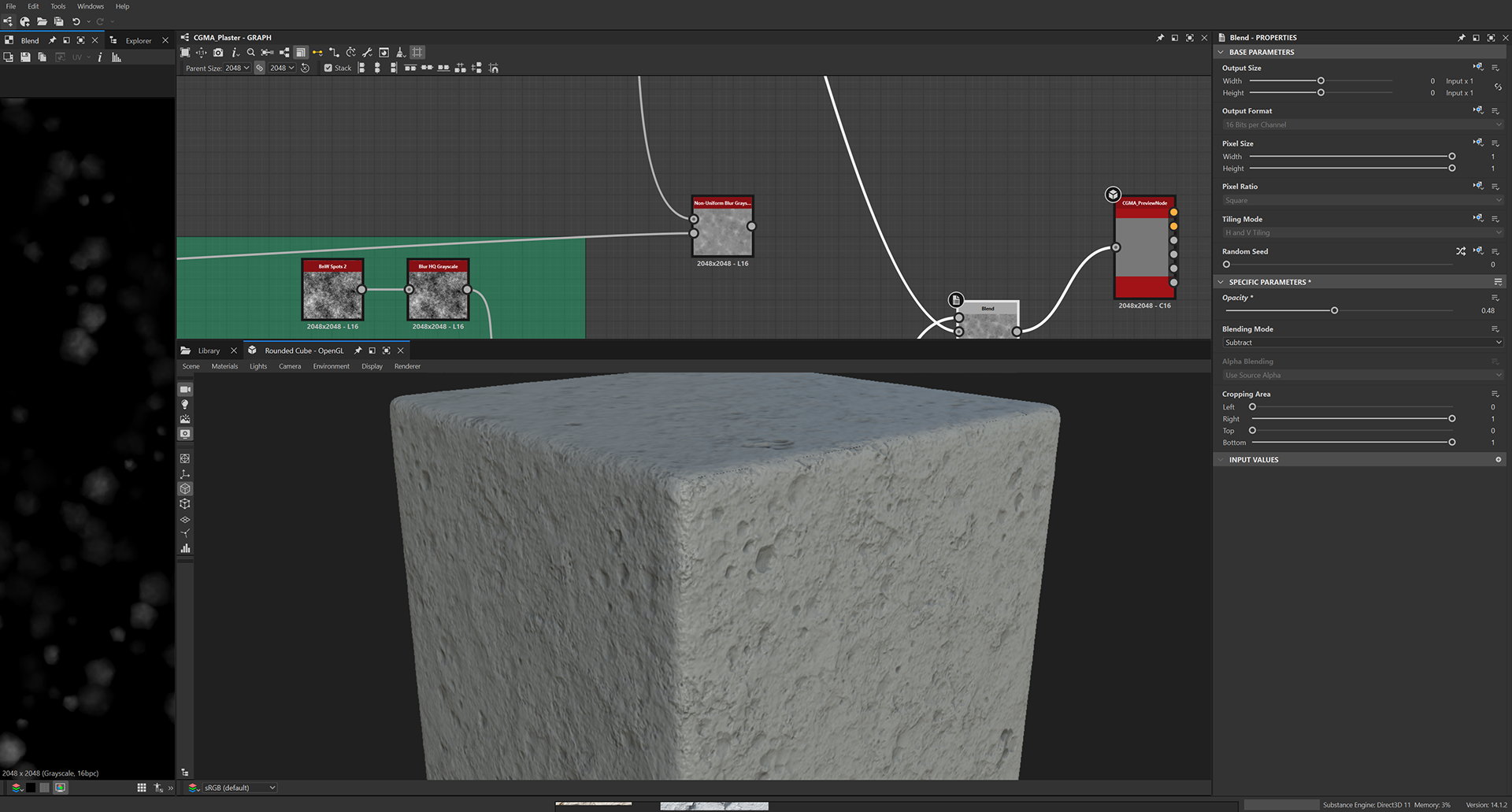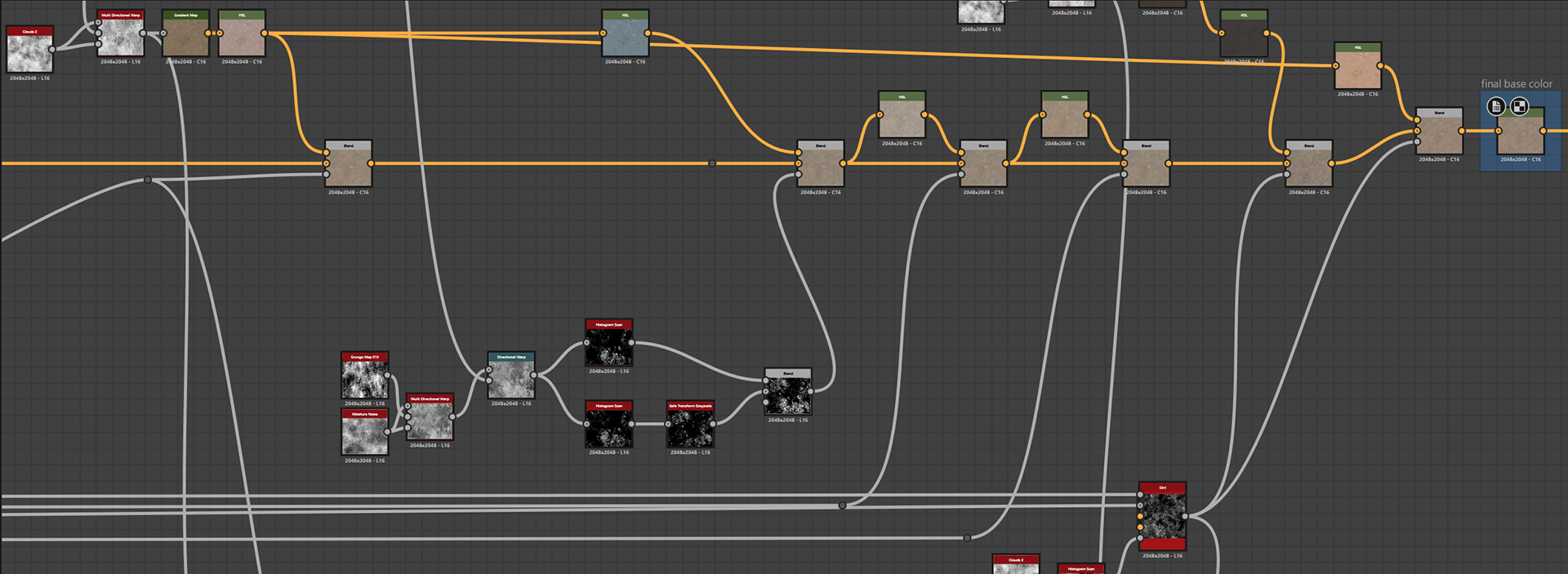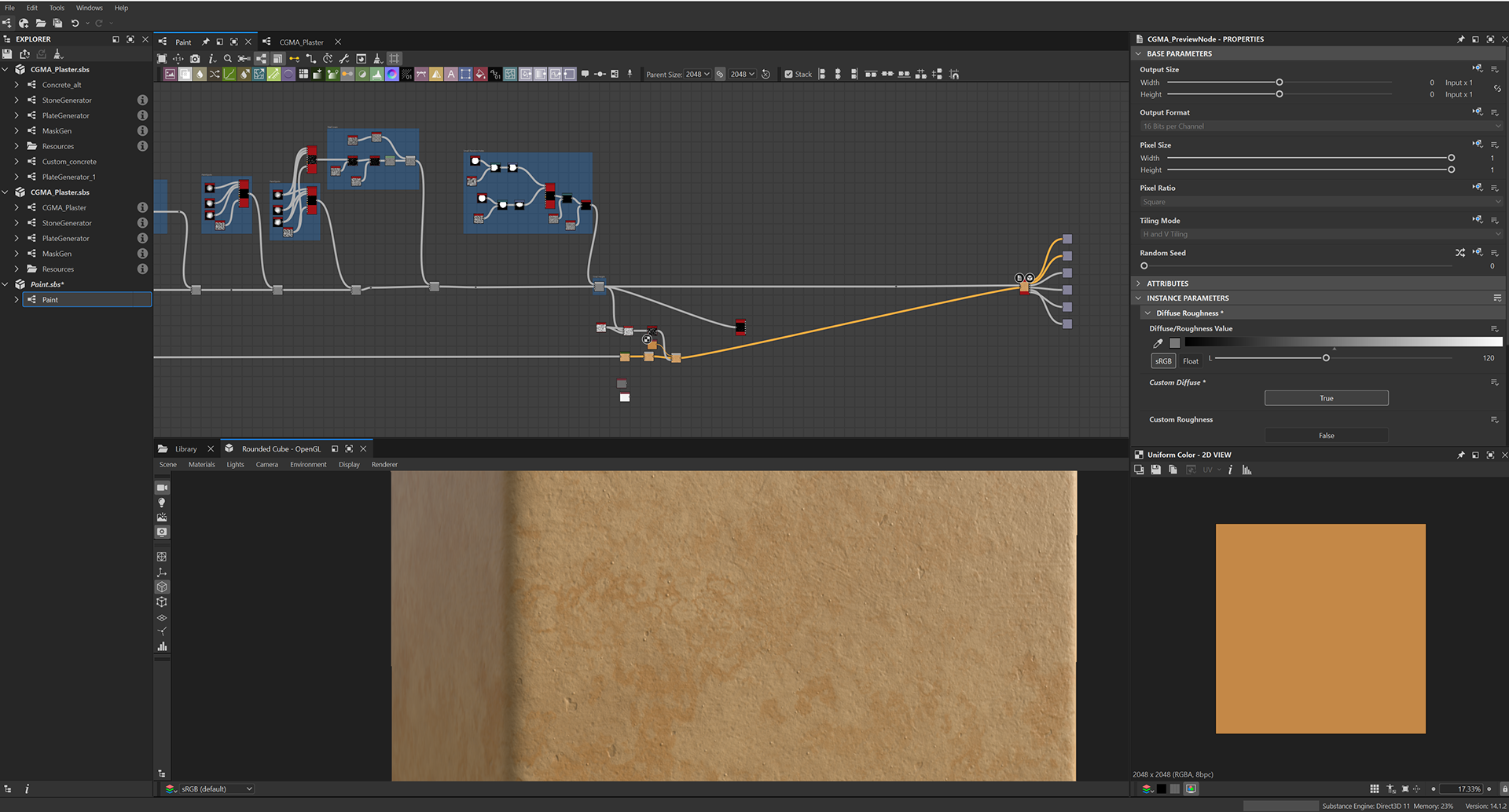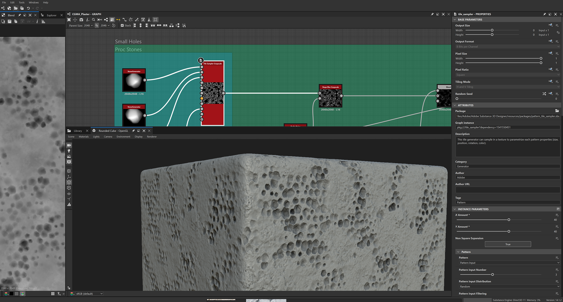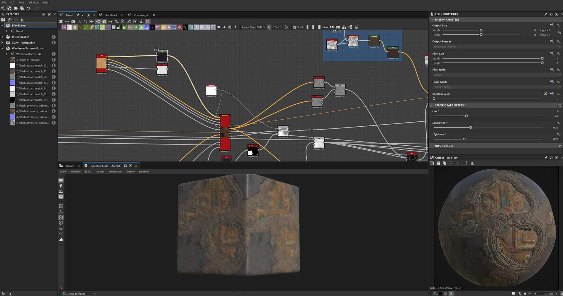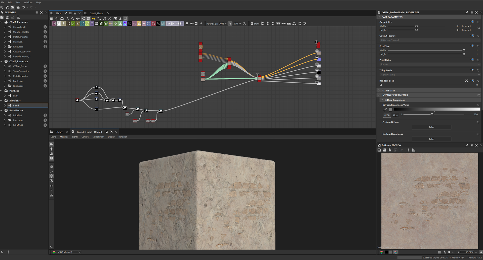 Week 1: Initial layers developed and captured via Substance Designer. The target for this initial set was inspired by Thai temple ruins, which are characterized by flaking/ layered concrete, brick, and plaster. Experimentation surrounded creating these targets and testing the limits of the tools.