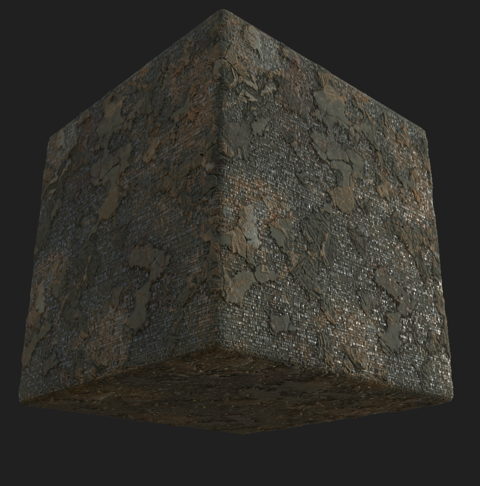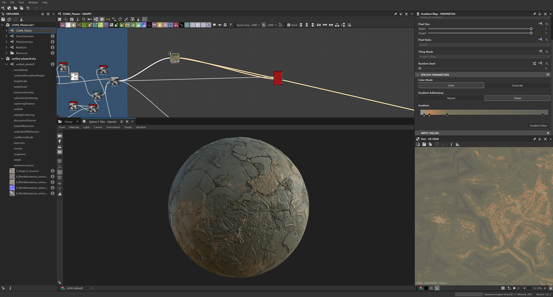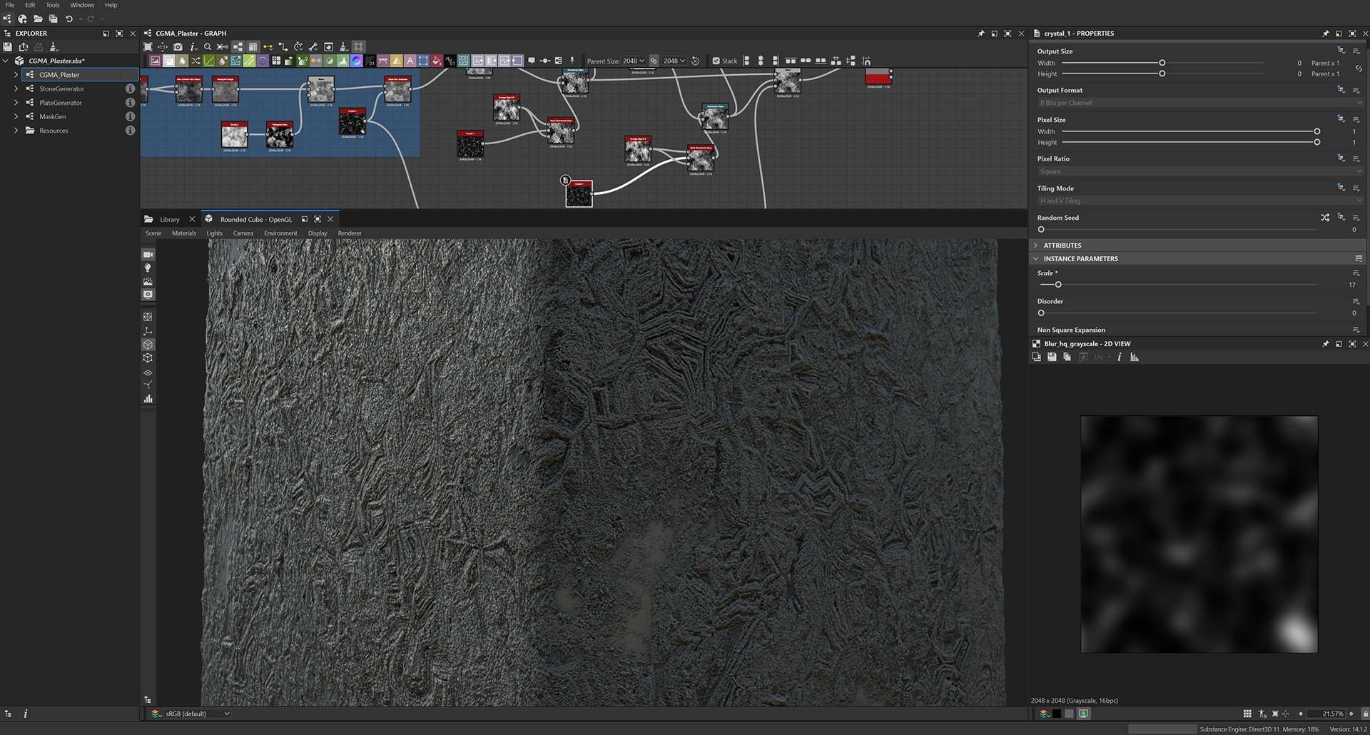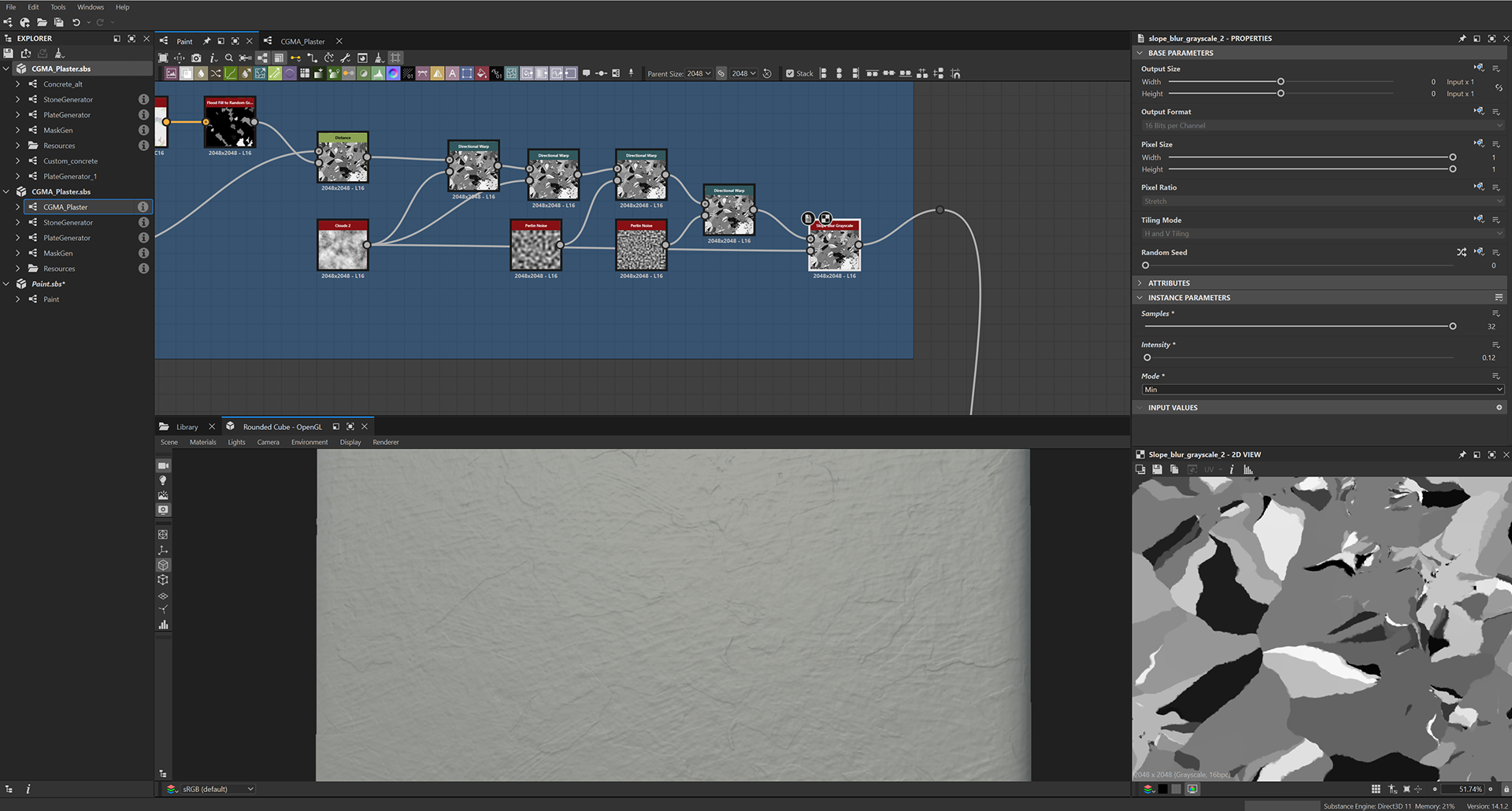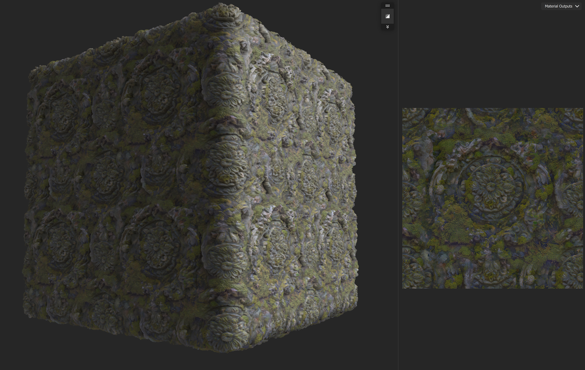 Week 1: Initial layers developed and captured via Substance Designer. The target for this initial set was inspired by Thai temple ruins, which are characterized by flaking/ layered concrete, brick, and plaster. Experimentation surrounded creating these targets and testing the limits of the tools.