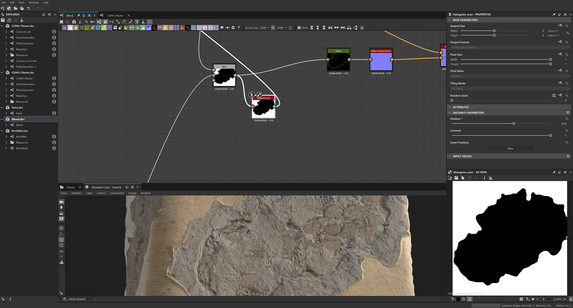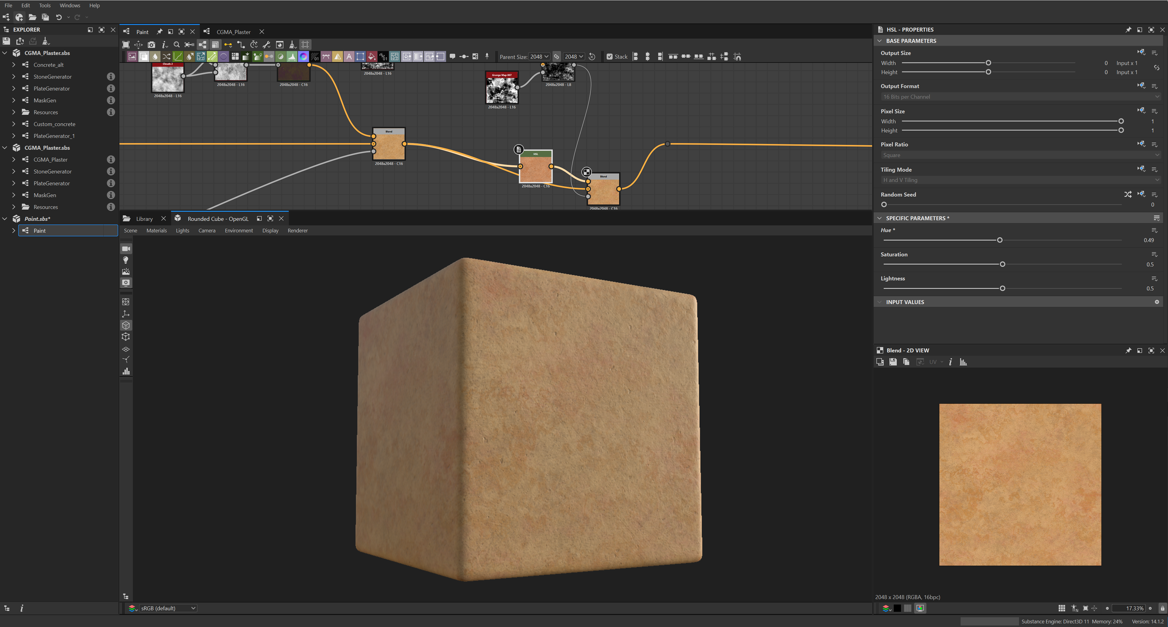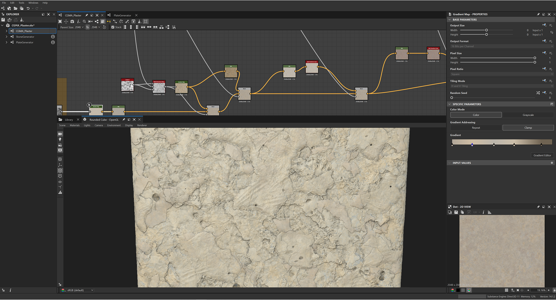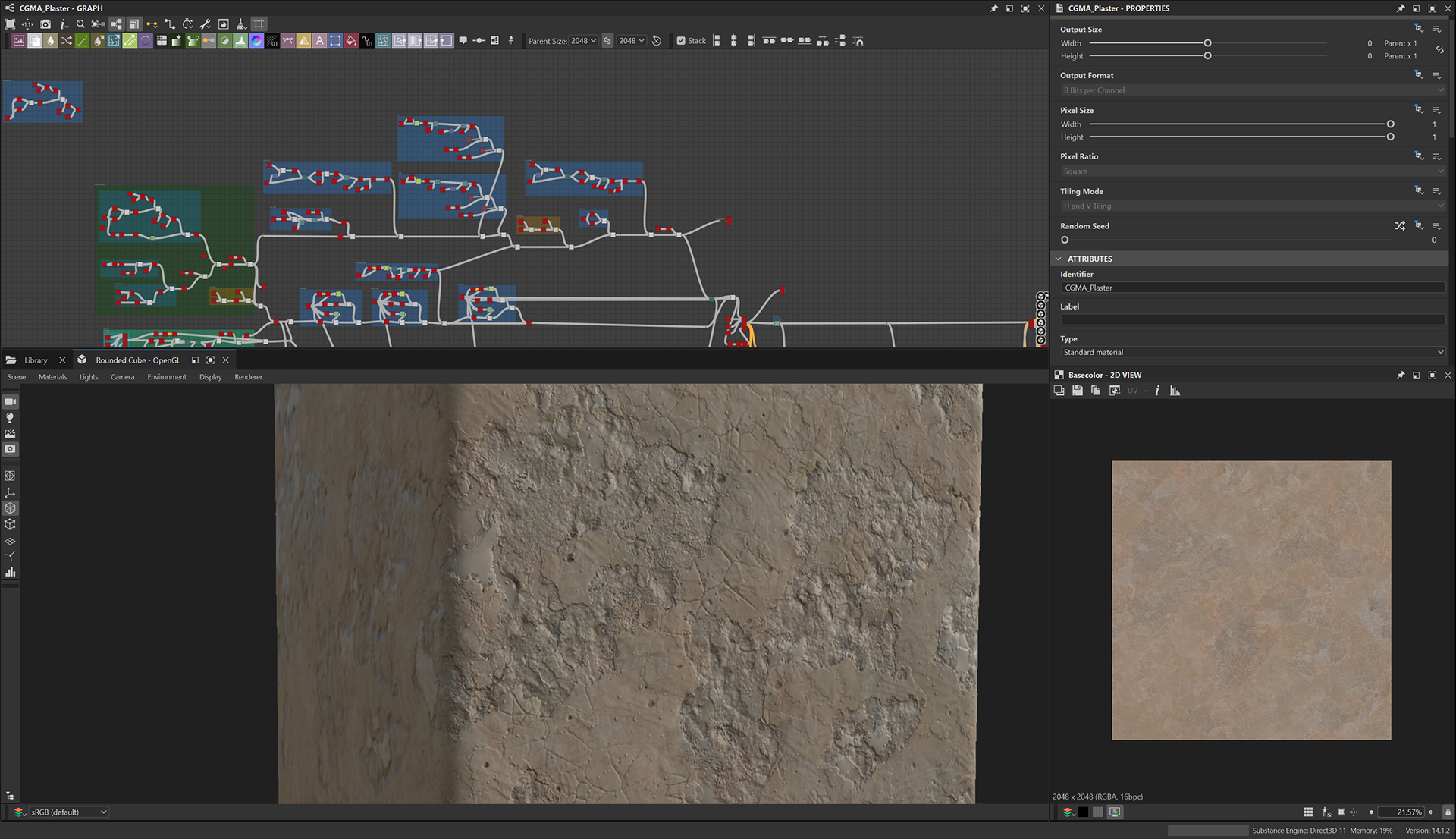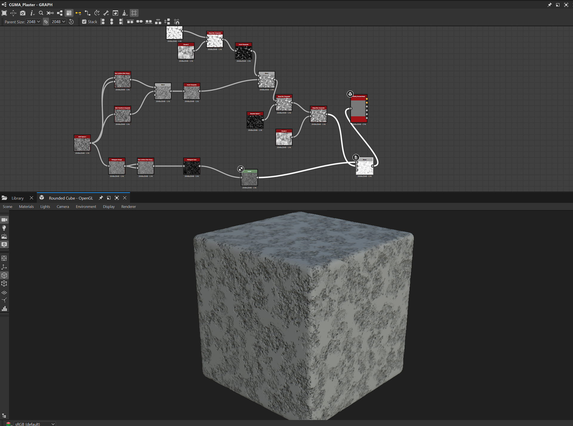 Week 1: Initial layers developed and captured via Substance Designer. The target for this initial set was inspired by Thai temple ruins, which are characterized by flaking/ layered concrete, brick, and plaster. Experimentation surrounded creating these targets and testing the limits of the tools.